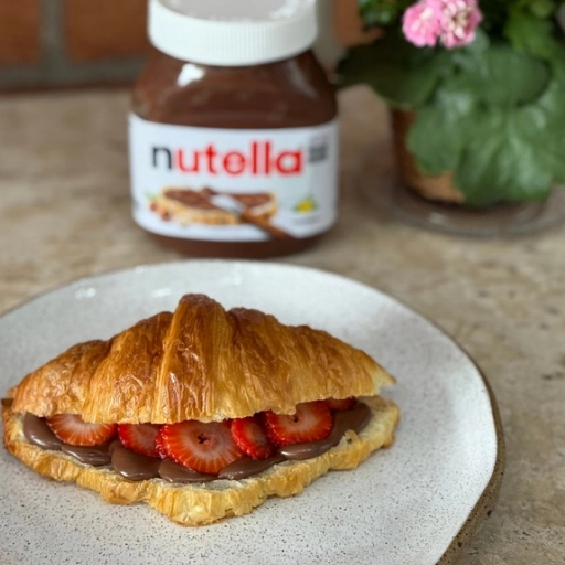 Croissant artesanal recheado com Nutella e morangos frescos. Finalizado com açúcar de confeiteiro. Irresisitível do i... Ver completo
