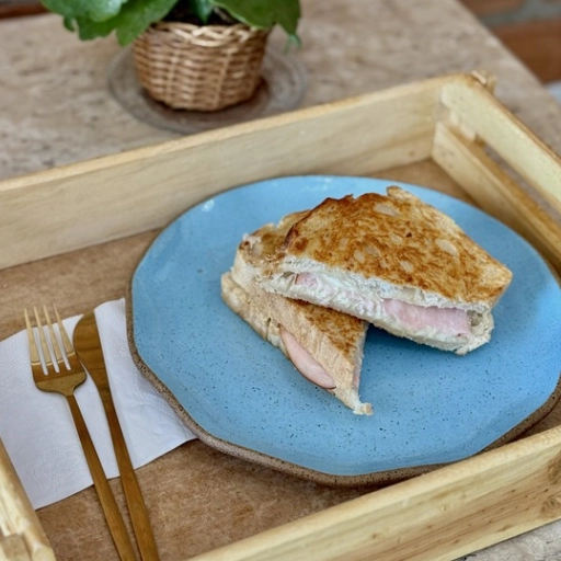 Pão sourdough rústico grelhado na manteiga, recheado com cream cheese, presunto de pernil defumado e muçarela.