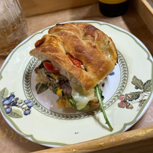 Sanduíche de rosbife, rucula, mostarda, queijo e tomate servido na nossa deliciosa Focaccia de fermentação natural