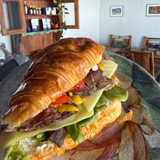 Delicioso Croissant massa de fermentação natural recheado com rosbife, rúcula, mostarda, muzarela e tomatinho cereja