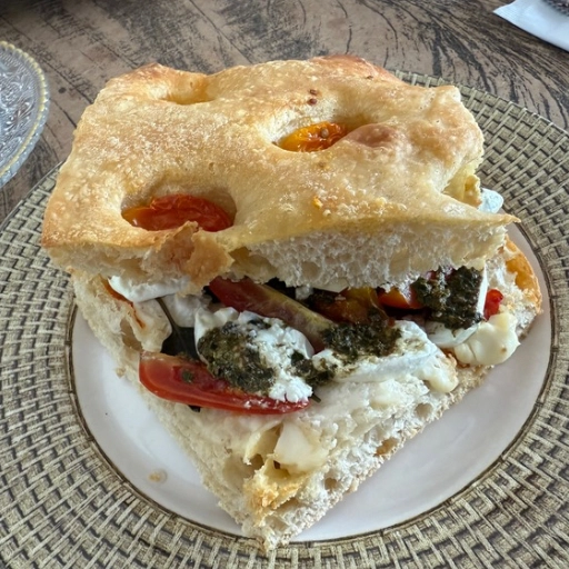 Nossa deliciosa Focaccia de tomate cereja com sal grosso recheada com Cream cheese, tomate cereja, muzarela de Búfula, ... Ver completo